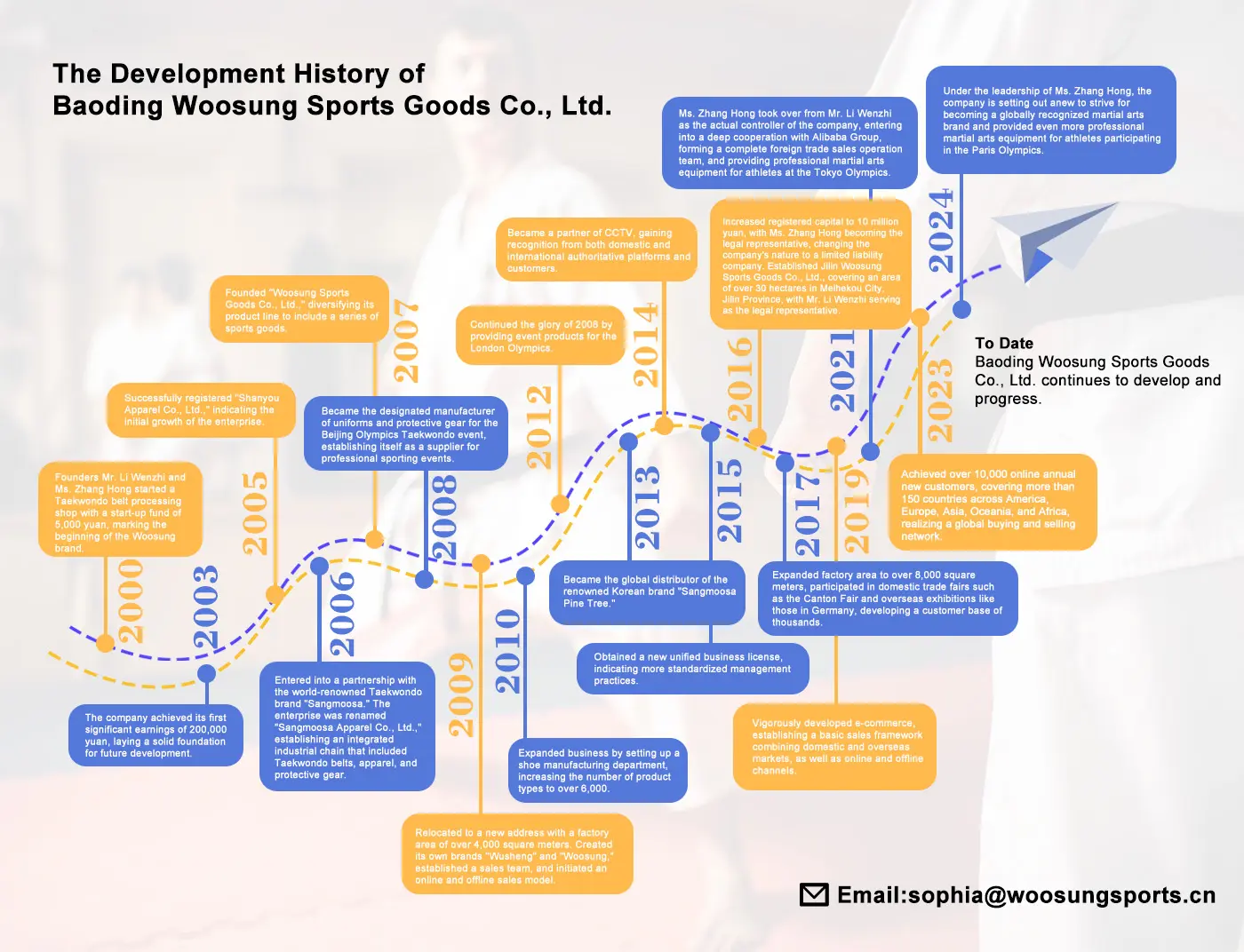 Im Jahr 2016 erhöhte Woosung Sports Goods sein registriertes Kapital auf 10 Millionen Yuan, wobei Frau Zhang Hong als gesetzlicher Vertreter fungierte und das Unternehmen in ein Unternehmen mit beschränkter Haftung verwandelte. Bis 2017 erweiterte das Unternehmen das Fabrikgebiet auf über 8.000 Quadratmeter und nahm an zahlreichen inländischen und internationalen Messen wie der Canton Fair in China und den Handelsshows in Deutschland teil und entwickelte Beziehungen zu über tausend Kunden auf.